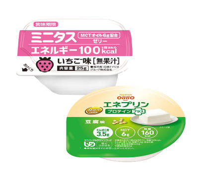 現在ではその知見を活かし、高齢者の低栄養を防ぐためのMCT配合食品に加え、飲み込みを助けるとろみ剤や、噛む力が衰えた方でも食べやすい栄養補給食品や飲み物など、さまざまな介護食を開発しています。